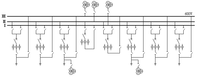 (2) 600V电压等级有6条进出支路,主接线采用双母线带旁路;每条支路所接设备(变压器或线路或电源或负荷)可灵活选择。