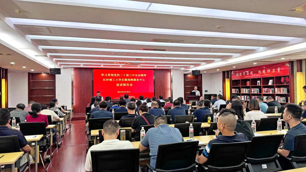 9月25日上午,后勤中心学习贯彻党的二十届三中全会精神宣讲报告会在云塘校区图书馆B102会议室举行。校理论宣讲团成员、人事处处长刘宏伟作宣讲报告。后勤中心党委书记王学成主持。后勤中心全体党员、入党积极分子,各部门副职以上人员共80余人参会。