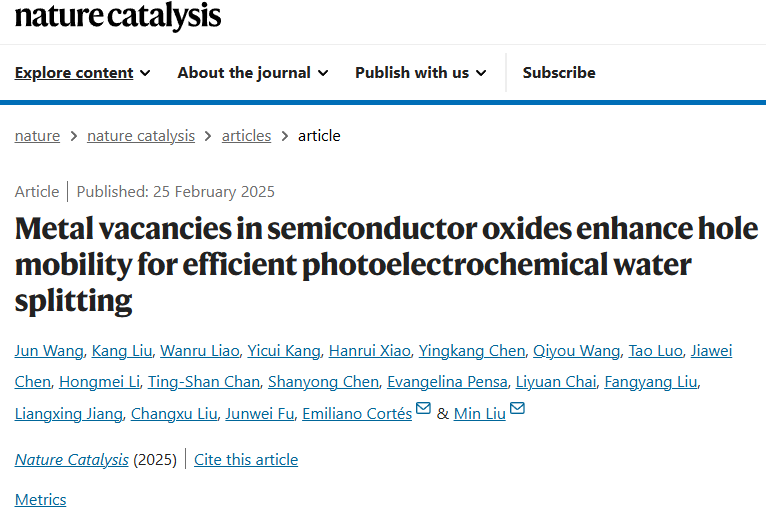 化学与医药工程学院教师以第一作者在国际顶级期刊《Nature…北京时间2025年2月25日18:00,国际顶级期刊NatureCatalysis在线发表了我院王君博士的最新研究成果“Metal vacancies in semiconductor oxidesenhance hole mobility …